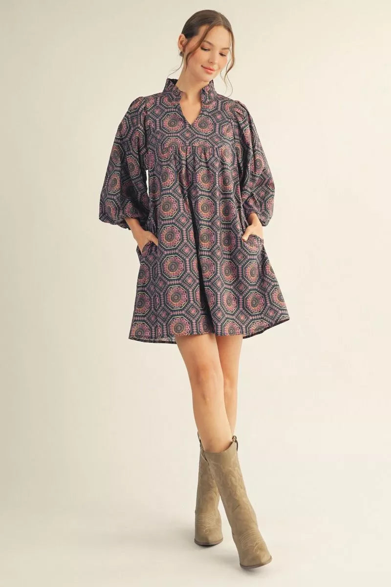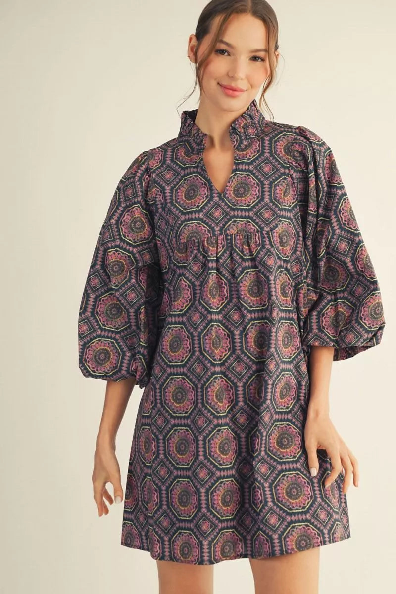 3/4 puff sleeves boho print babydoll dress with side pockets, ruffled high neckline.
