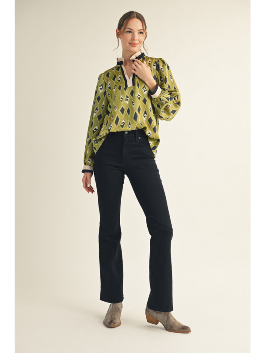 Long sleeves diamond & tiny floral print top with ruffled mock neckline.