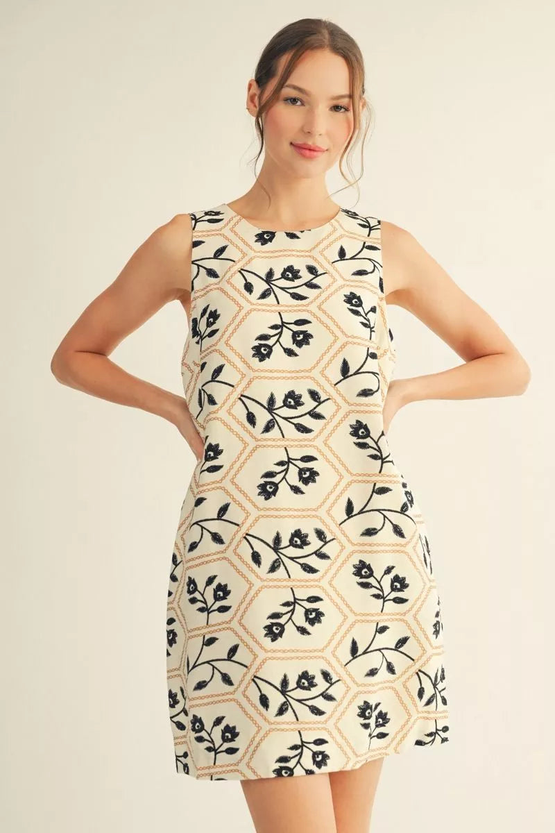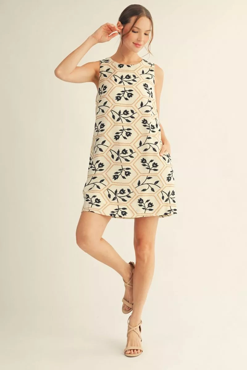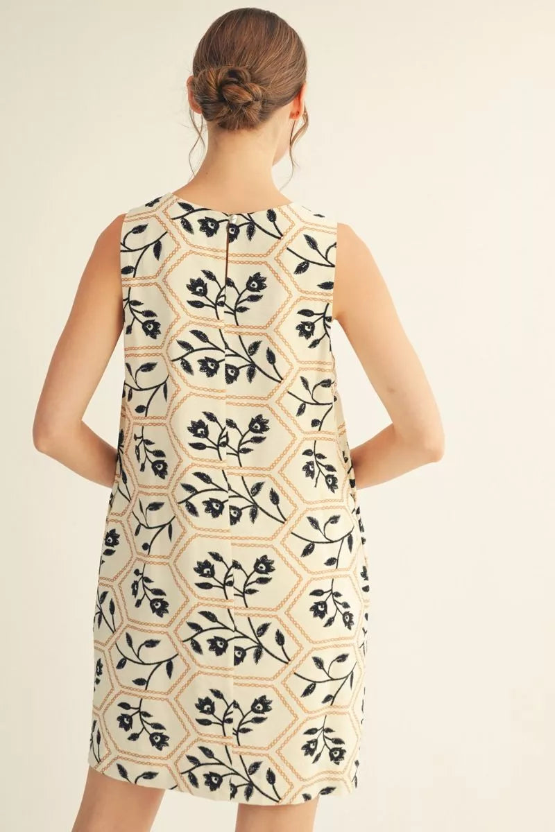 Sleeveless floral embroidery print shift dress with side pockets, button closure back. Easter.