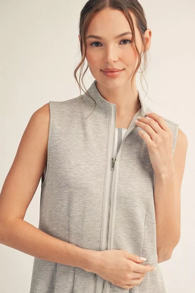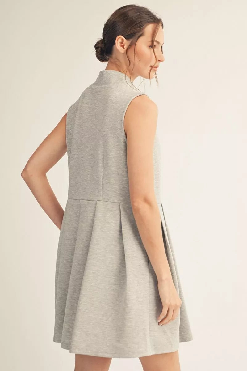 Sleeveless high neck front zip up casual dress with pleat detail, color band contrast accent, side pockets.