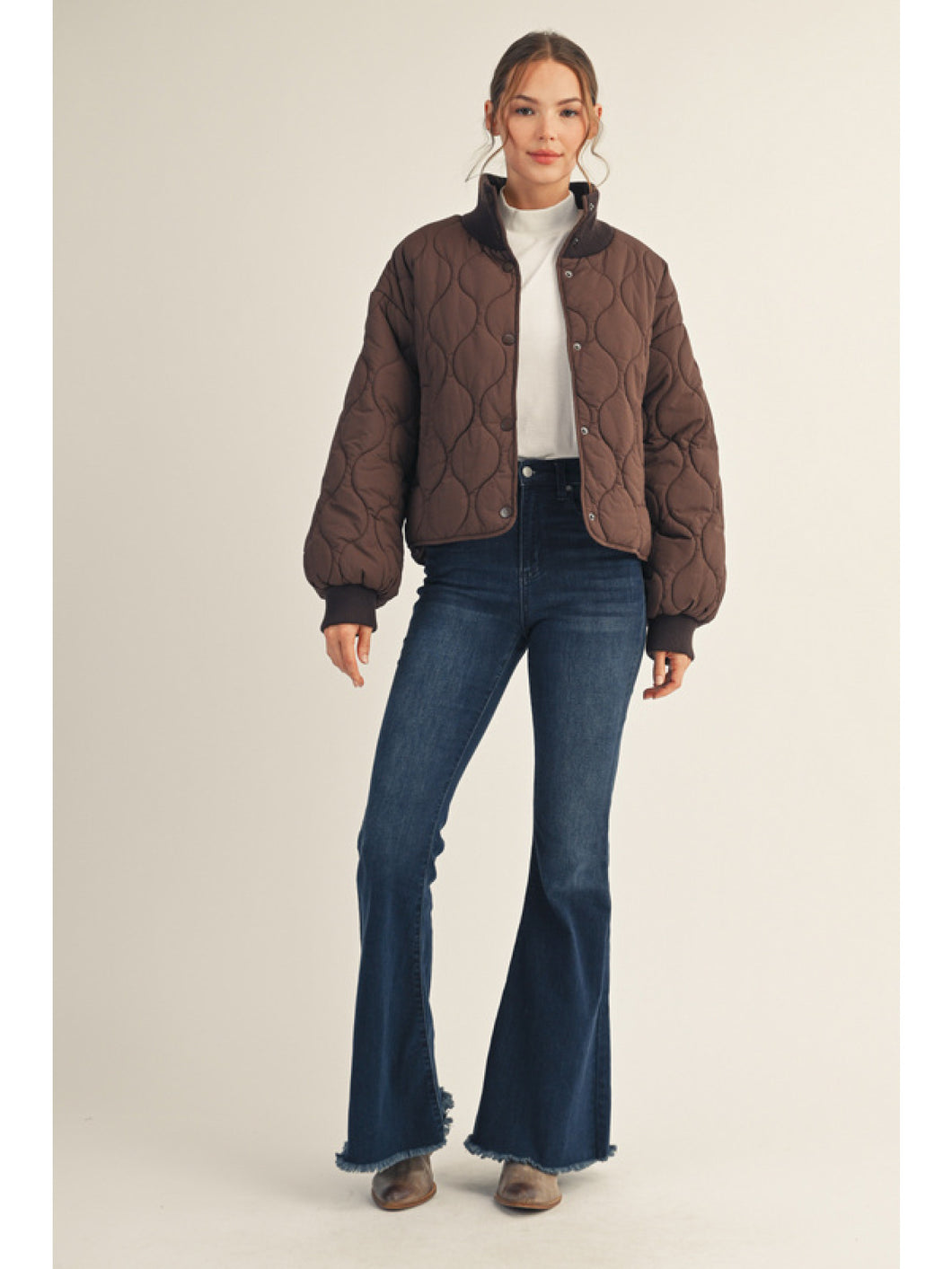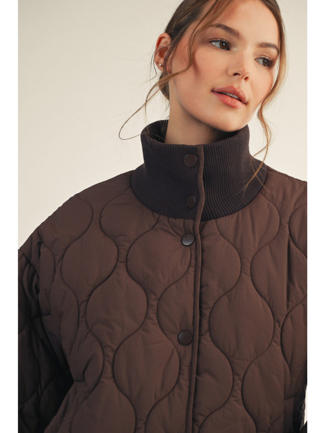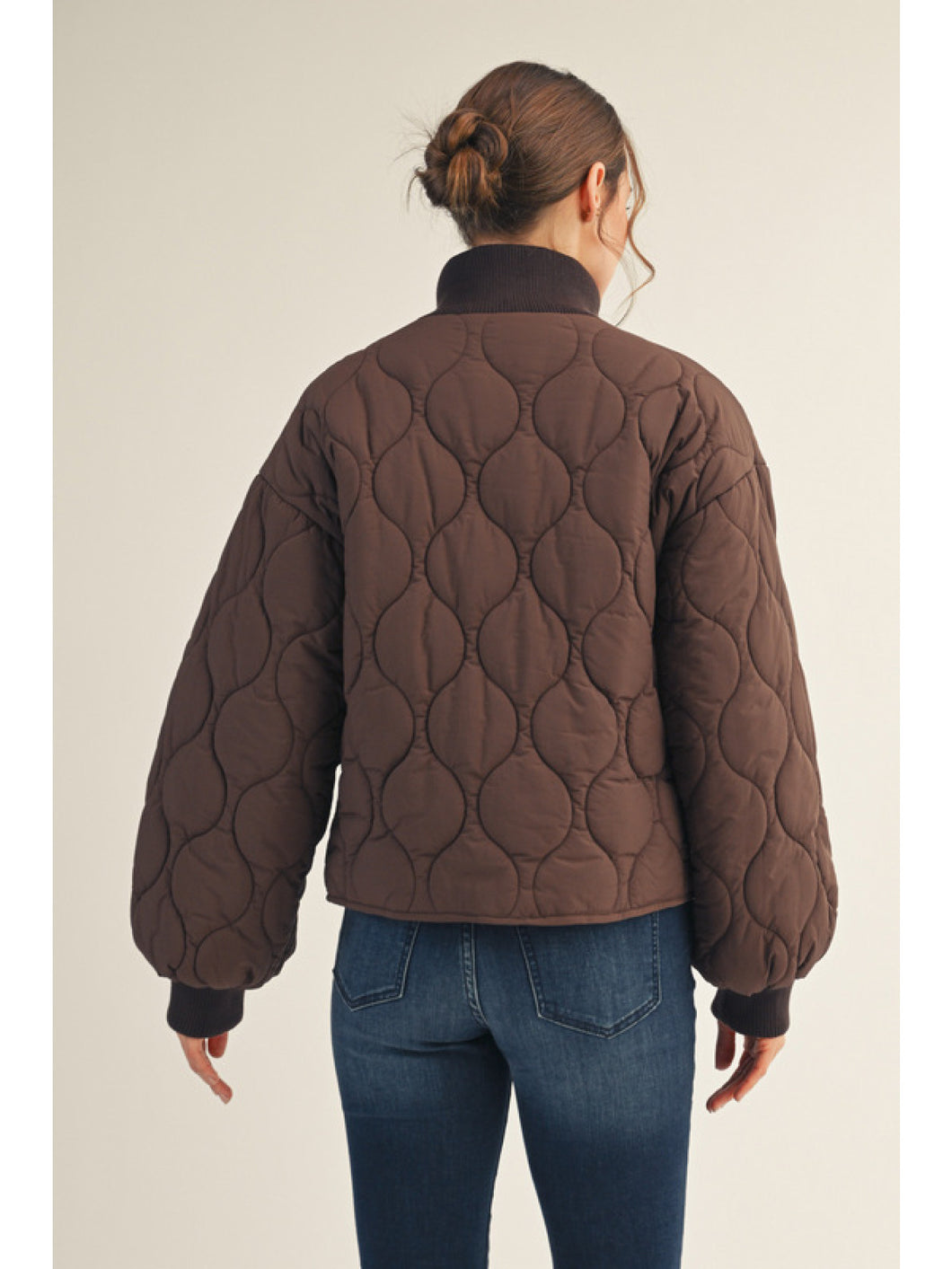 Long puff sleeves button down quilted puffer jacket, high neck, side pockets.
