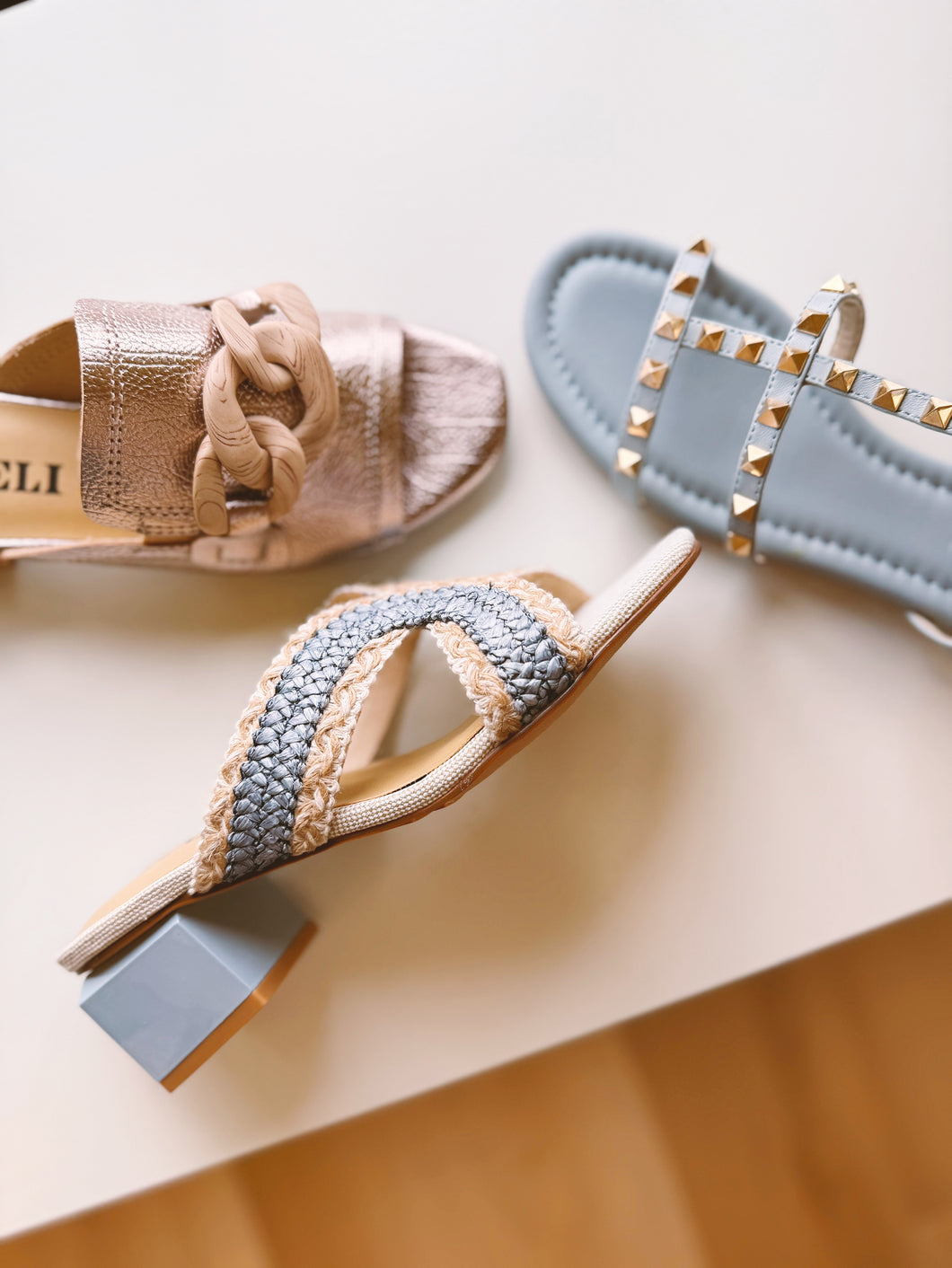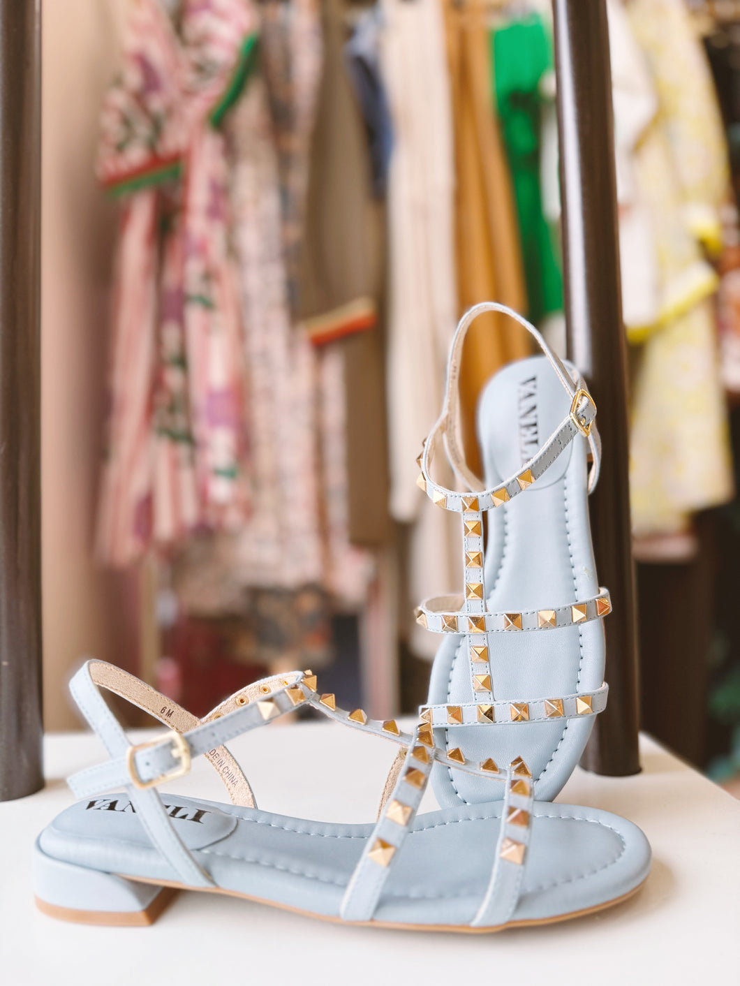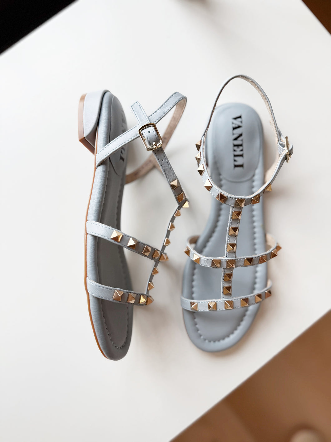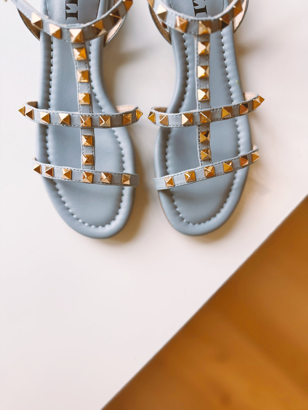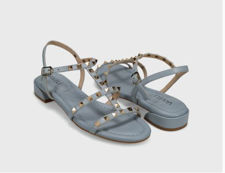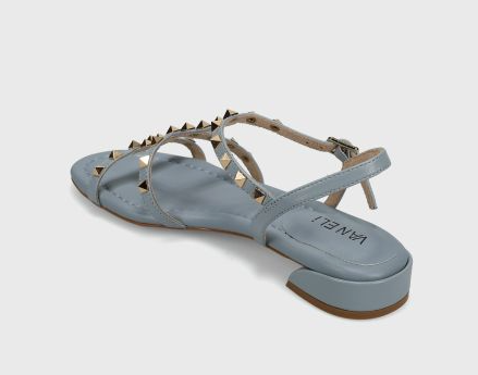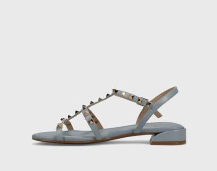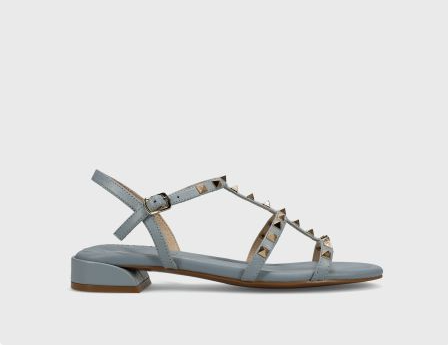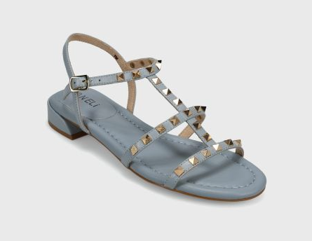 T-strap leather sandal with metal pyramid studs. Buckle strap with hidden elastic insert. Padded insole. Rubber sole. 1 inch covered heel.