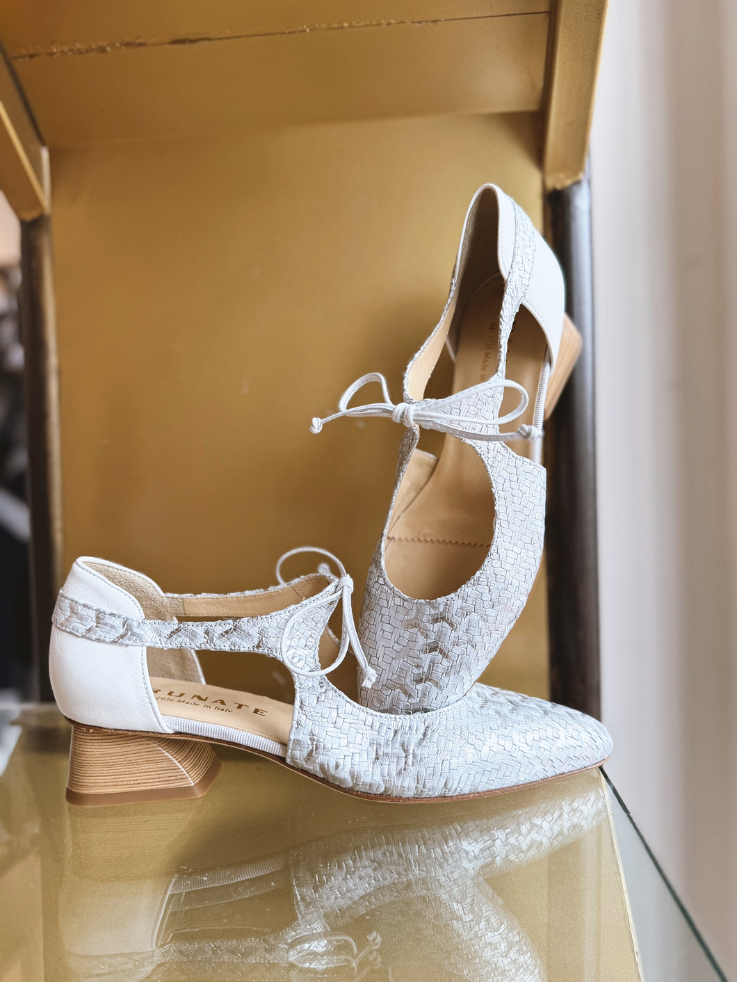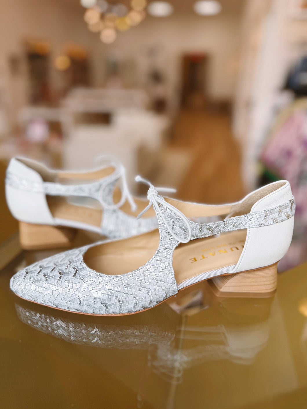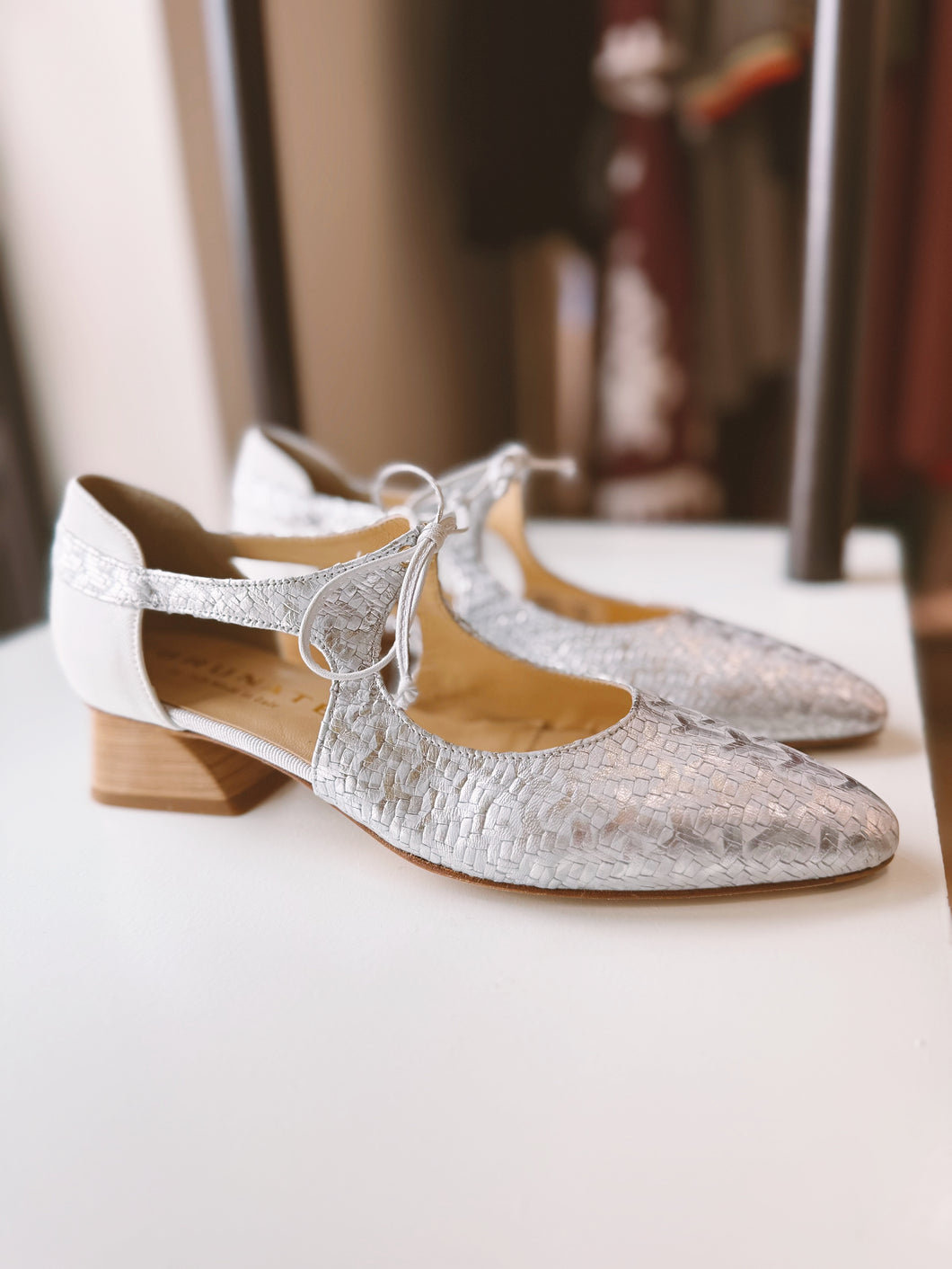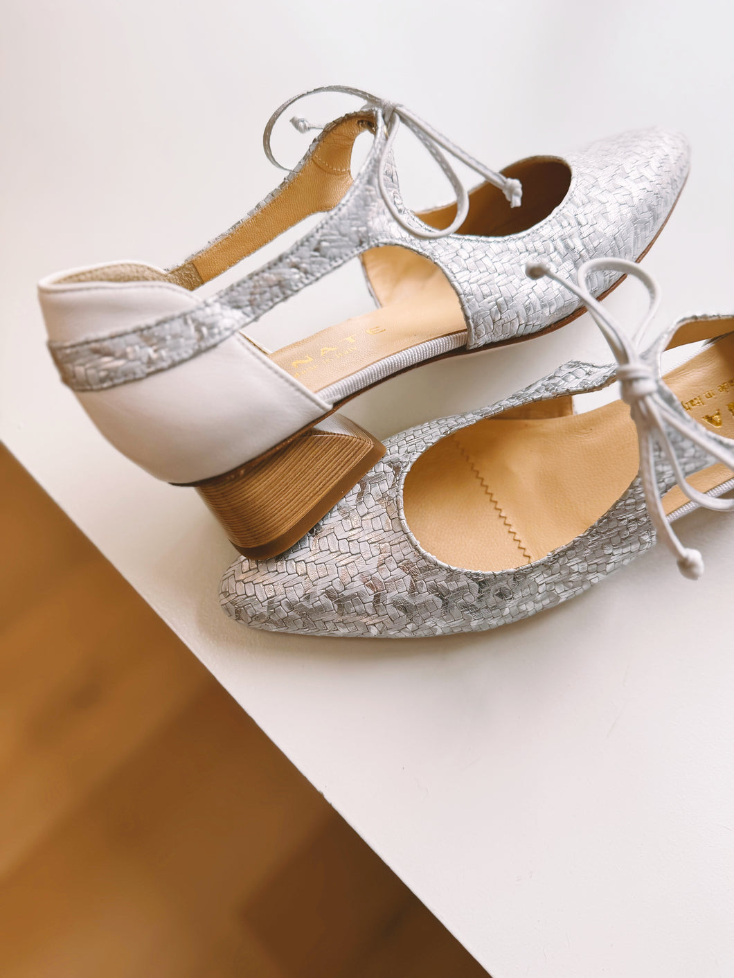 This stunning heel from Brunate is beautiful on the foot. Comfort is key, but the look is what stands out -- a classic silhouette with a twist. This one has a gorgeous textured silver leather brown detail on the upper paired with a solid cream that compliments the shoes beautifully. Brunate shoes hug the foot like a glove and fit like a dream. Handmade in Italy since 1926 with premium leathers and materials, your feet and wardrobe will never be happier!