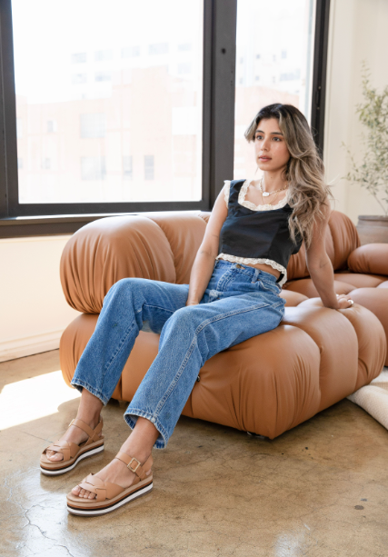Breeze updates the retro platform with clean lines, rich tan leather, and bold contrast striping. The woven straps add dimension, the gold buckle seals the look.