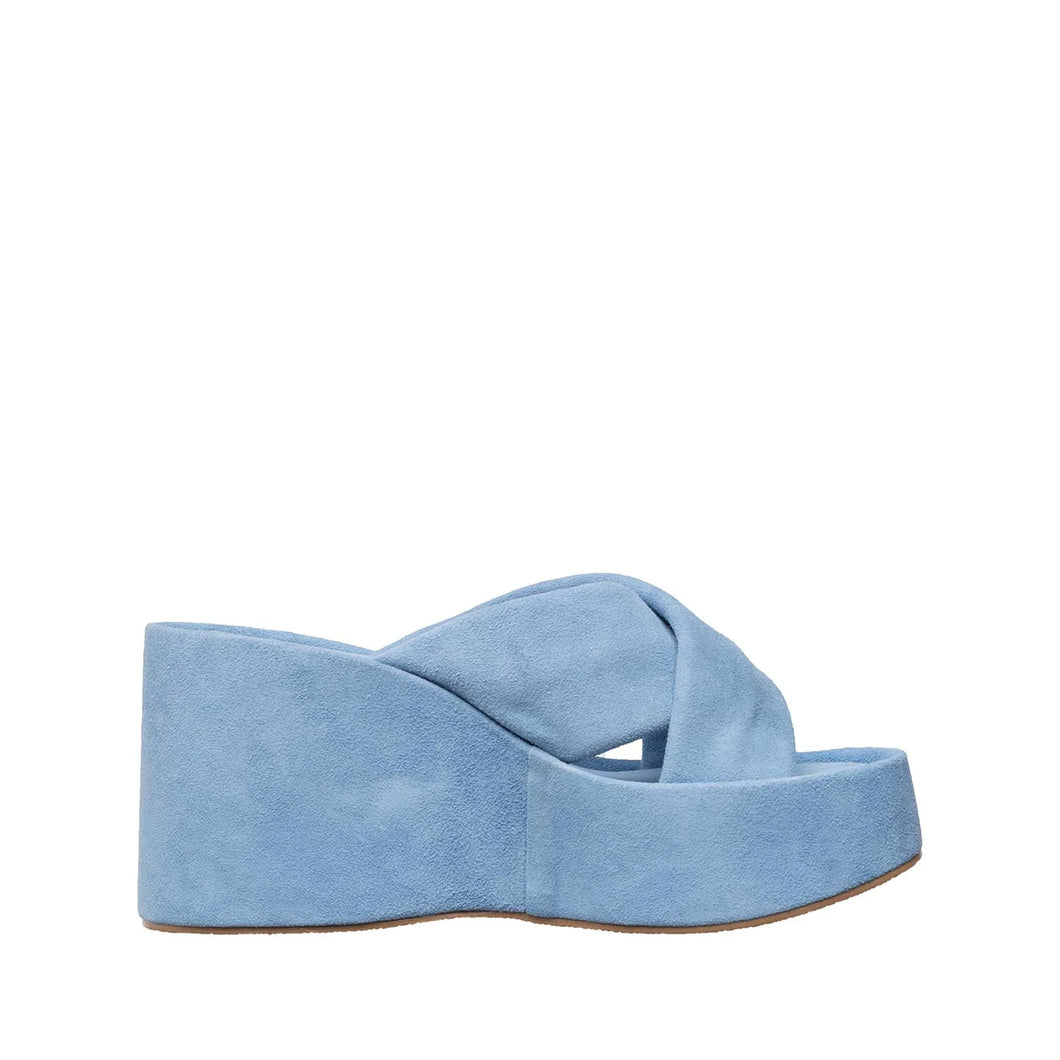 Emma brings suede crossover wedge slides platform comfort style to your everyday wardrobe. Crafted from fine quality suede in a light blue finish, these handcrafted slides feature a sculpted 2.0-inch wedge platform and crossed upper straps that cradle the foot with ease. A latex-cushioned insole, coated in smooth breathable leather, delivers reliable comfort from morning to evening. As a simple slide silhouette, the Emma pairs effortlessly with any outfit and suits every occasion—whether you're running errands or meeting friends for dinner.
