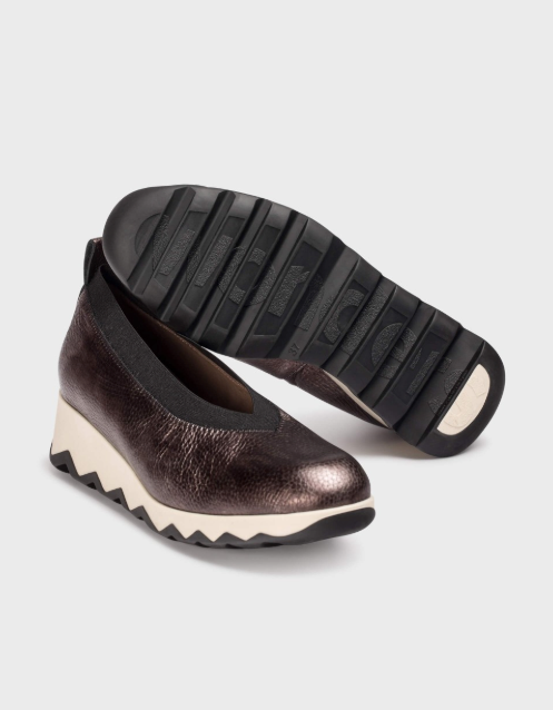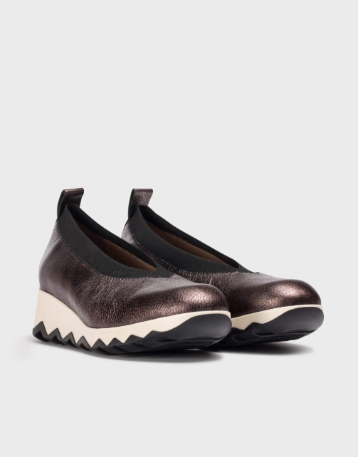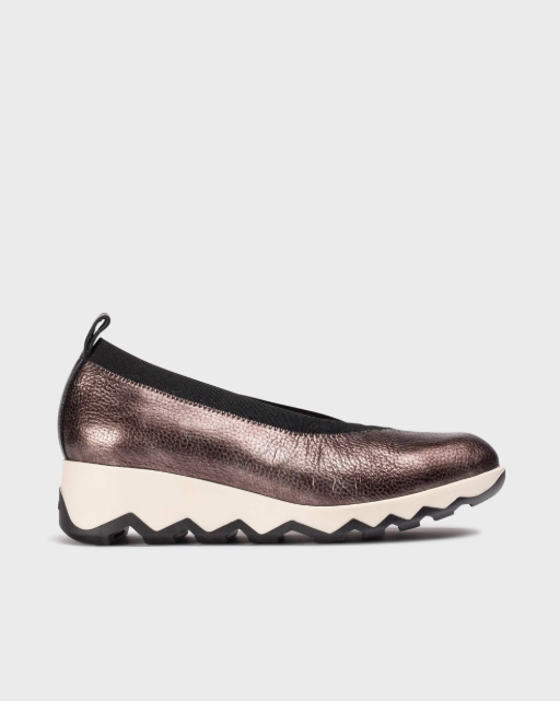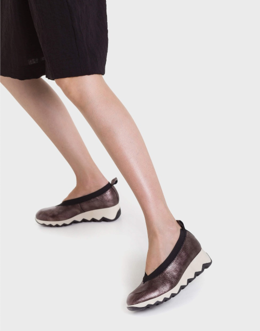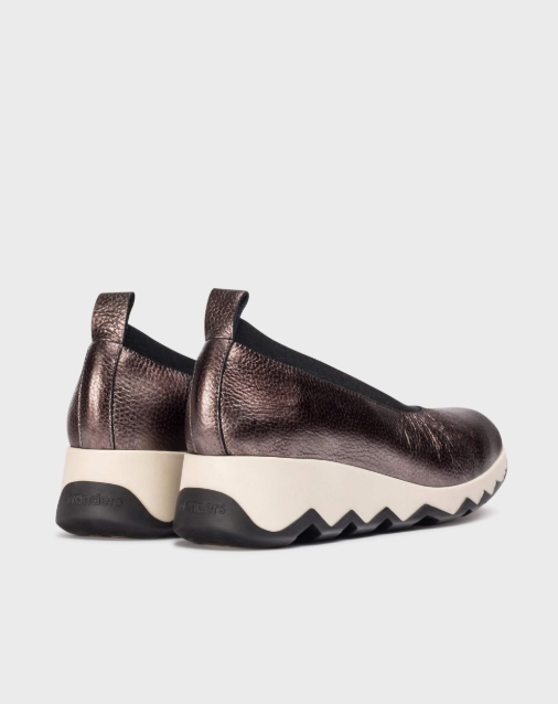 Shoes crafted in metallic lead leather. This contemporary and sophisticated model redefines comfort with an elasticized edge that ensures a perfect fit and snug wear. The two-tone serrated sole developed with EvoLight technology provides lightweight cushioning and flexibility, while the removable MemoryGel insole ensures exceptional comfort. Wonders is committed to responsible manufacturing certified by LEATHERWORKINGGROUP.