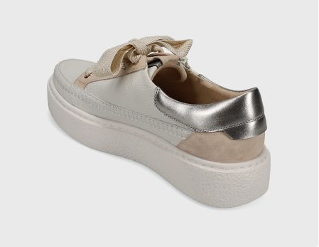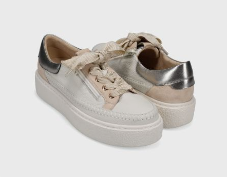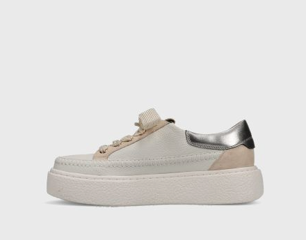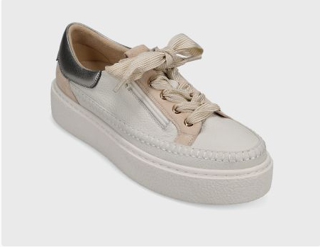 Platform athleisure sneaker in grained leather with blanket stitching. Wide laces and side zipper. Padded heel collar. Ultra-padded removable insole. 1.5 inch textured rubber sole.