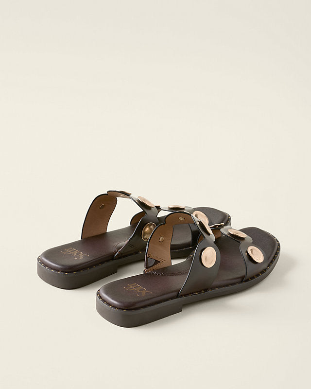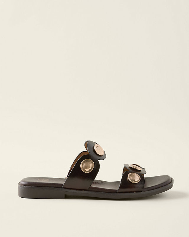 A little bit luxe, a little bit laid-back, for workdays, getaways, weekend play — and nights out too. Crafted in Italian leather, featuring a duo of sculptural straps accented with oversized stud detailing for standout style and a cushioned footbed for round-the-clock comfort.
